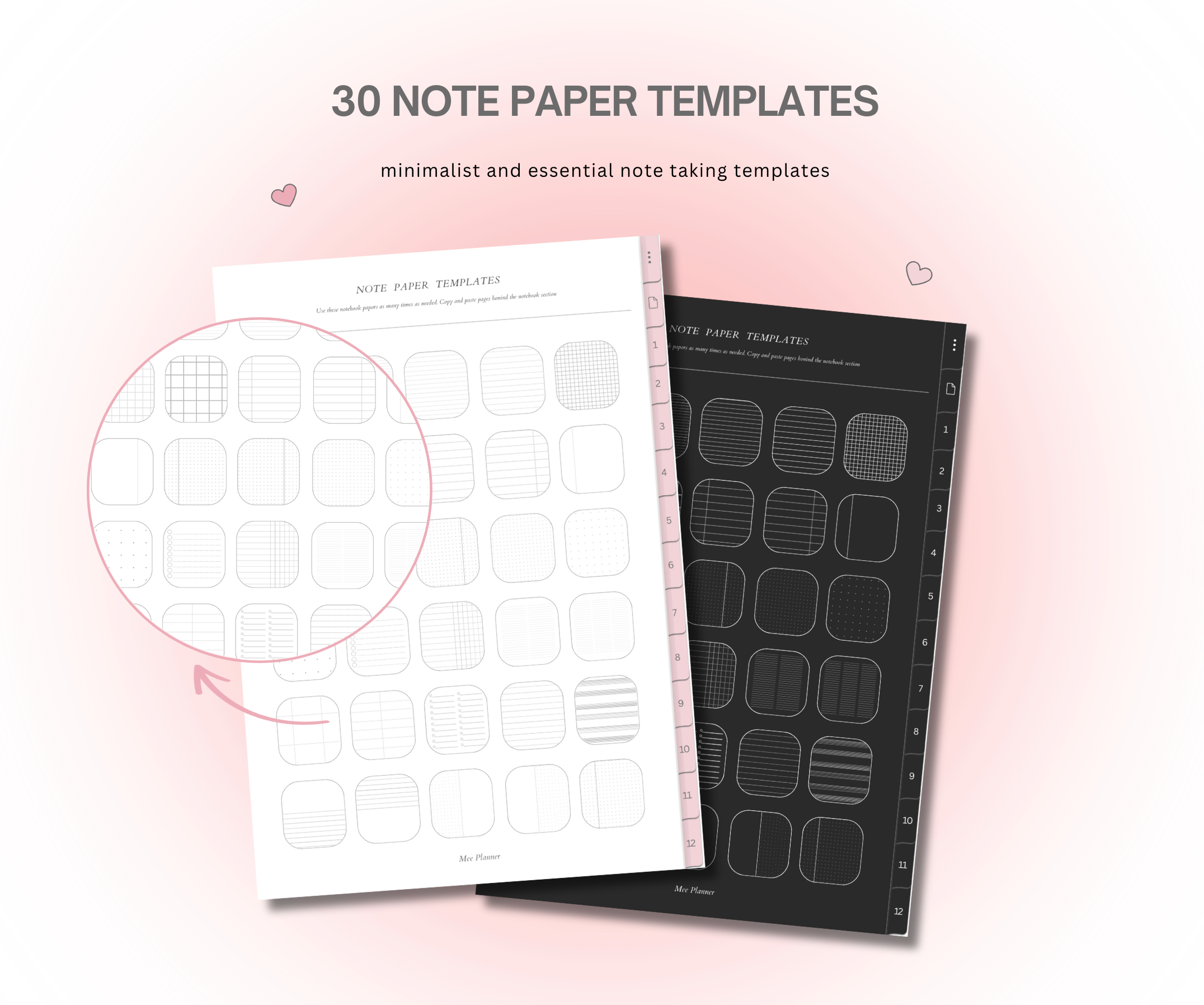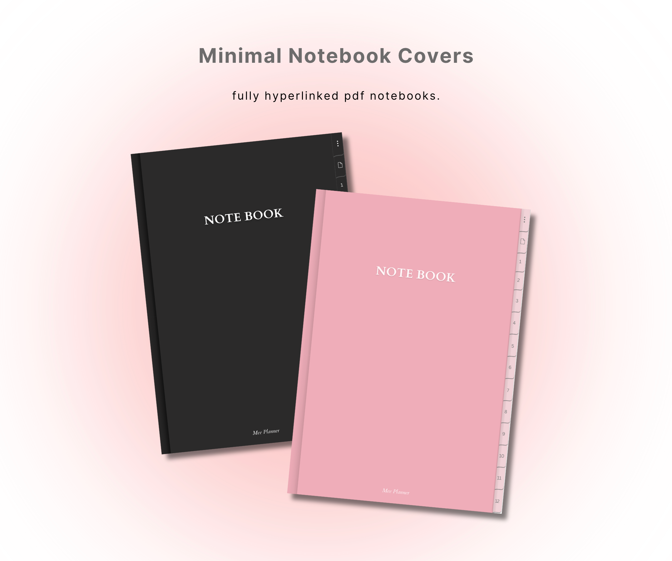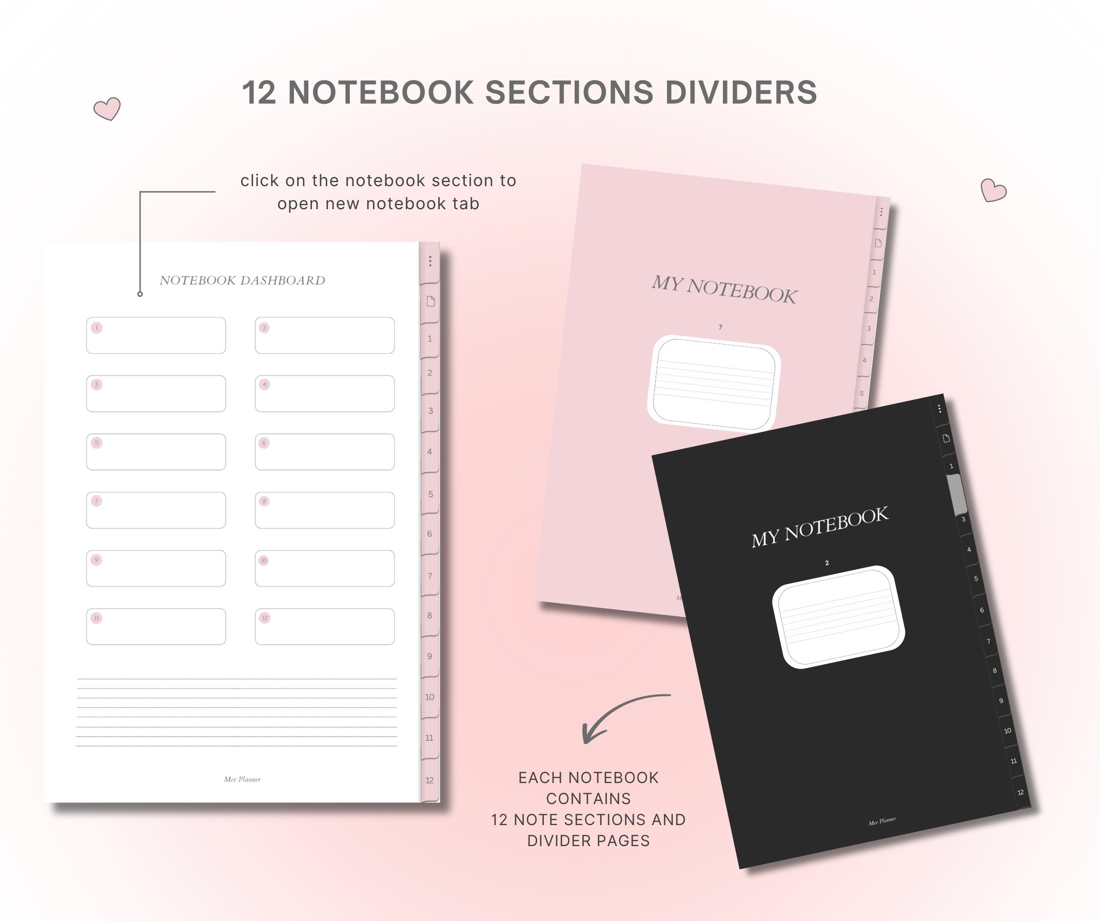 -2 PDF Digital Notebooks with PINK & BLACK tabs NOTEBOOKS (12 Sections and 30 Note Paper Templates in each planner included like blank, lined, dotted, squared, cornell and other various papers)