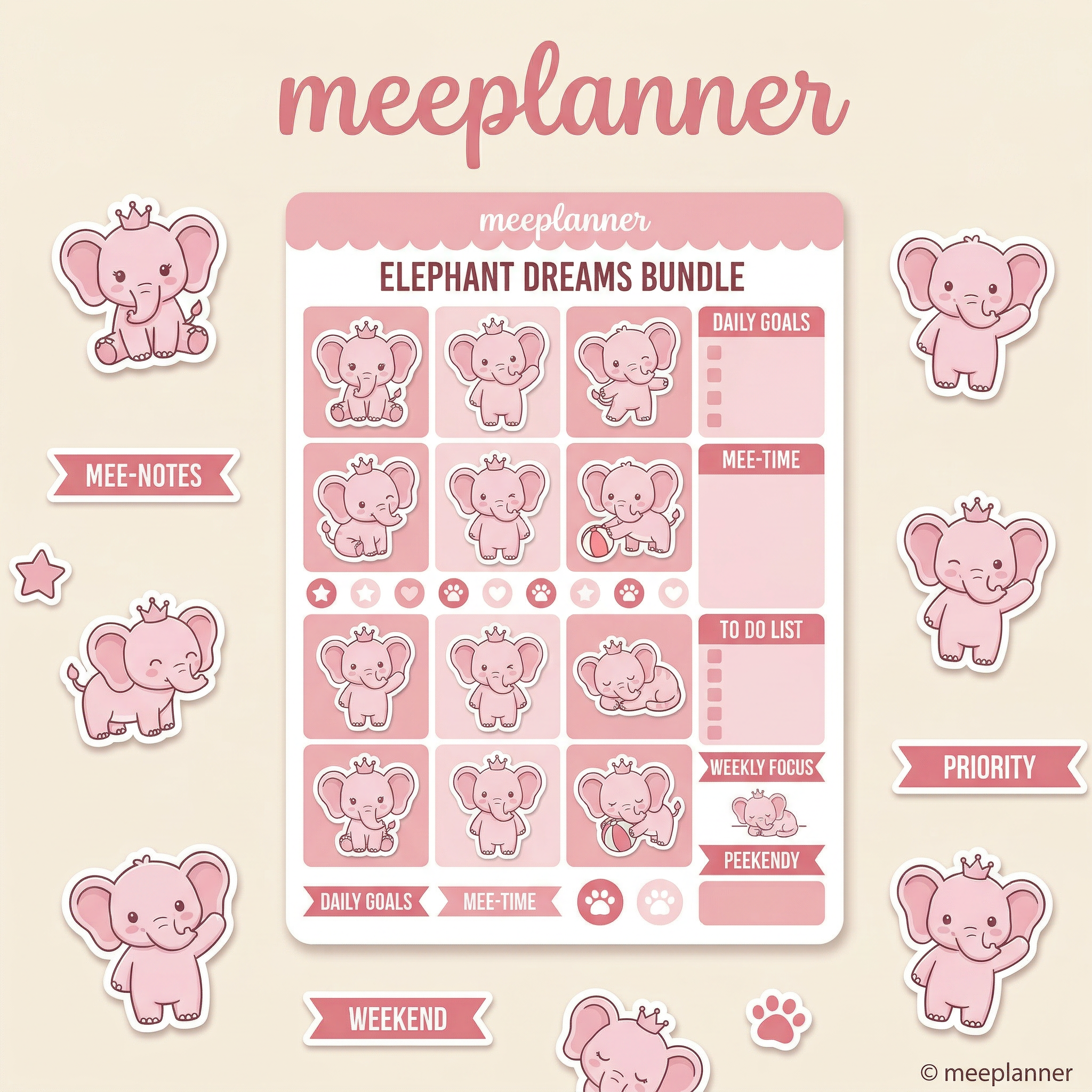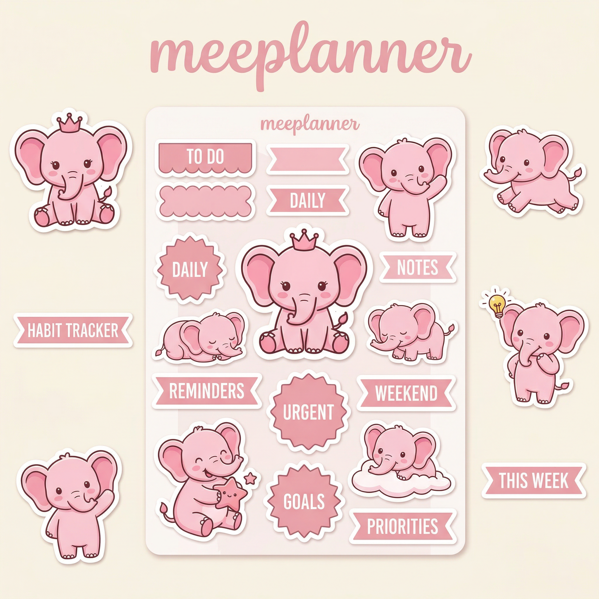 Meet Miu Jiu — the cutest little pink Elephant that's about to take over your planner. This adorable kawaii sticker pack features our original hand-drawn pink Koala character (and her green Koala friends!) with over 50 unique expressions, functional planner labels, day-of-the-week tags, and decorative elements. Every sticker is designed to make your digital planner feel playful, personal, and ridiculously cute.